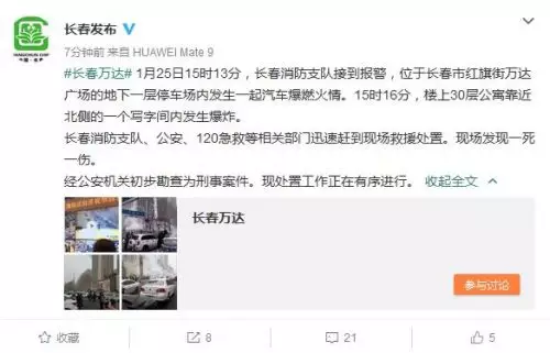 通報介紹,1月25日15時13分,長春消防支隊接到報警,位於長春市紅旗街萬達廣場的地下一層停車場內發生一起汽車爆燃火情。15時16分,樓上30層公寓靠近北側的一個寫字間內發生爆炸。長春消防支隊、公安、120急救等相關部門迅速趕到現場救援處置。現場發現一死一傷。