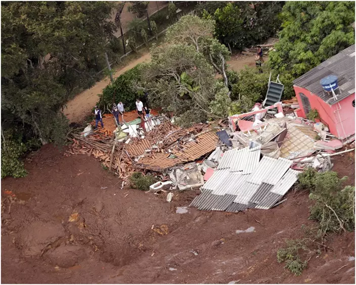 決堤後,大量泥漿和垃圾衝向淡水河谷公司在布魯馬迪紐市的地區總部和附近村落,摧毀不少建築物和民居。