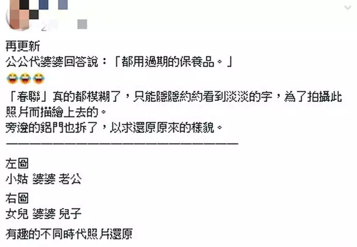 該女網民上載照片時留言﹕「有趣的不同時代照片還原」,兩張照片可見背景一樣,連背後的三輪車和梯子也放在同一位置上。而婆婆穿著一模一樣的衣服,擺出同樣的姿勢,只是她的髮型隨時代改變,以及抱著身旁的兩個小孩不一樣,由兒子和女兒,變為孫子和孫女。