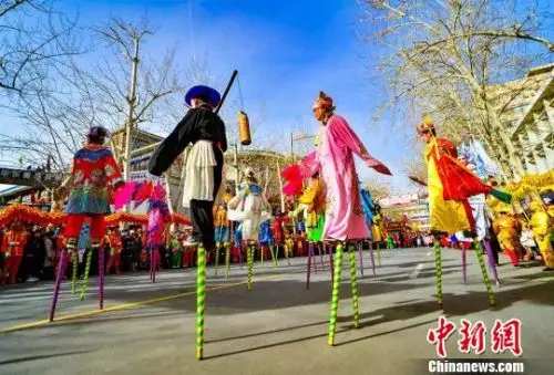 2月10日,在敦煌街頭進行的社火踩高蹺表演。 王斌銀 攝