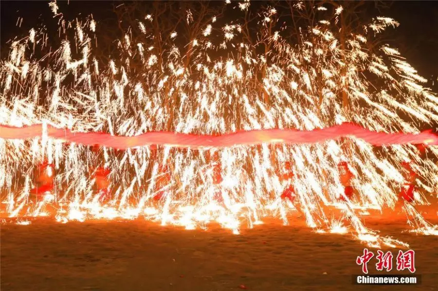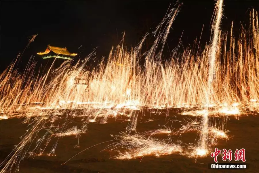 2月9日,農曆正月初五晚間,一場「打鐵花」視覺盛宴在河南開封萬歲山春節廟會上演。絢燦的鐵花在空中綻放飛舞,場面甚是壯觀,吸引了近萬人觀賞。據悉,本屆開封萬歲山春節廟會將持續至正月十六,廟會期間每晚將有2場打鐵花表演。據表演者介紹,「打鐵花」是由小煉鐵爐將生鐵化成鐵水後,用木板將鐵水加鋸末打上天空,鐵水瞬間在空中飛濺形成「鐵花火雨」的景象。韓章雲 攝