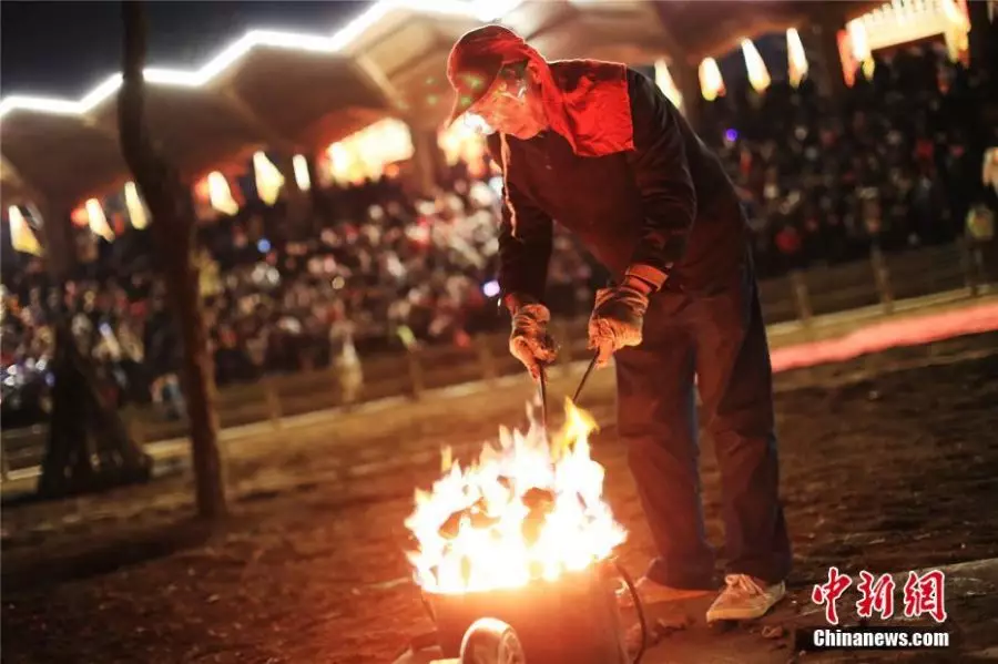 2月9日,農曆正月初五晚間,一場「打鐵花」視覺盛宴在河南開封萬歲山春節廟會上演。絢燦的鐵花在空中綻放飛舞,場面甚是壯觀,吸引了近萬人觀賞。據悉,本屆開封萬歲山春節廟會將持續至正月十六,廟會期間每晚將有2場打鐵花表演。據表演者介紹,「打鐵花」是由小煉鐵爐將生鐵化成鐵水後,用木板將鐵水加鋸末打上天空,鐵水瞬間在空中飛濺形成「鐵花火雨」的景象。圖為「打鐵花」之前,表演者將生鐵化成鐵水。韓章雲 攝