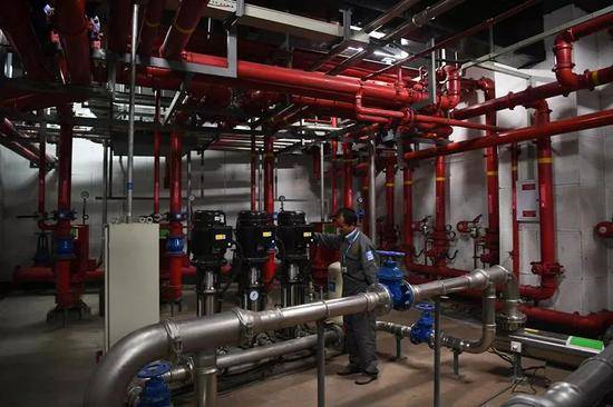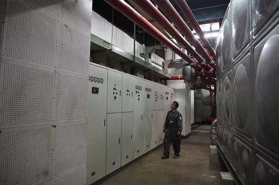 張鎖新的工作地點在噪音不斷、管道密佈的地下室機房。外人來到這裏才會明白,會議中心百米高的主樓,超過5萬平方米的建築面積,能隨時擁有清潔的用水,並非理所當然。