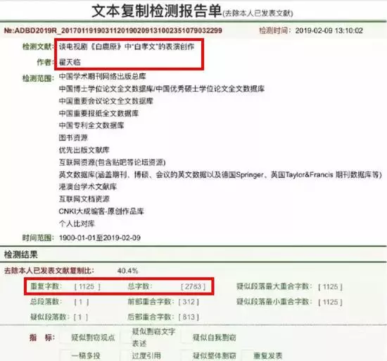 果不其然,從論文查重軟體的結果可以看出,這篇關於白鹿原的”論文“,妥妥的折了。現在,廣大憤怒的學界人士磨刀霍霍,已經向與翟天臨同期畢業的19名校友殺過去了。