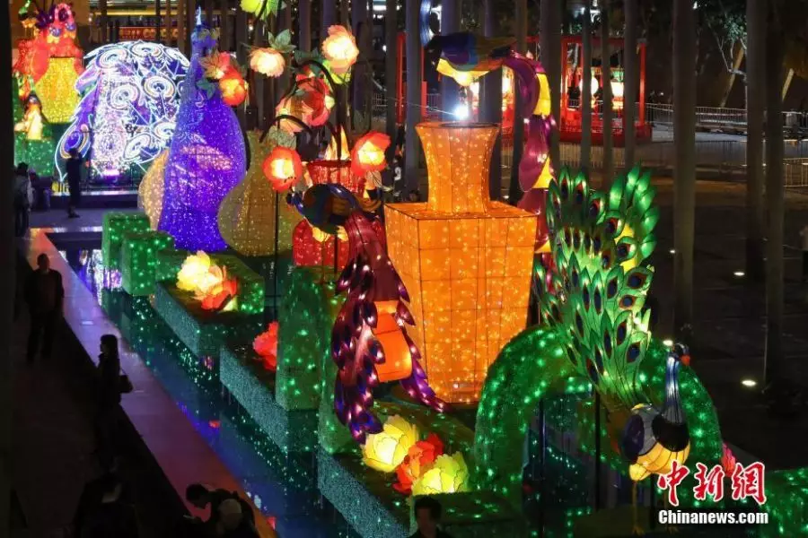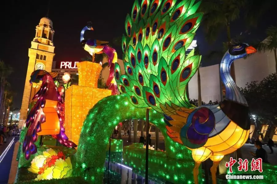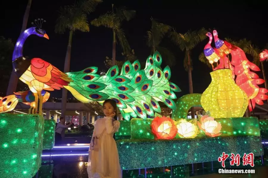 2月13日,元宵佳節將至,香港節日氣氛正濃。一組以中國傳統吉祥鳥孔雀為主題的春節專題彩燈展1月25日至2月24日在毗鄰維港的香港文化中心露天廣場舉行。中新社記者 謝光磊 攝
