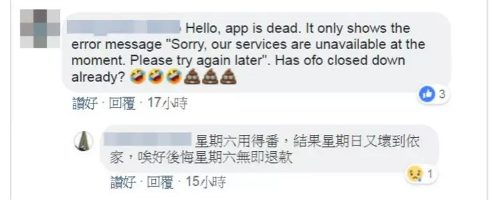 其實,早在上週起,已有不少ofo用戶在其Facenbook專頁上留言,指應用程式出現故障,無法退還按金,甚至無法顯示餘額,而且客服中心的熱線亦長期未有職員接聽,直到上周五(22日)應用程式終於回復正常,但在上周日(24日)又再度故障。不少用戶紛紛在專頁上留言,但亦未見有ofo的員工解答問題。有多名用戶在網上直言「係咪執左喇?個apps睇唔到仲有幾錢」,亦有人詢問「如果執嘅,退款點安排?」
