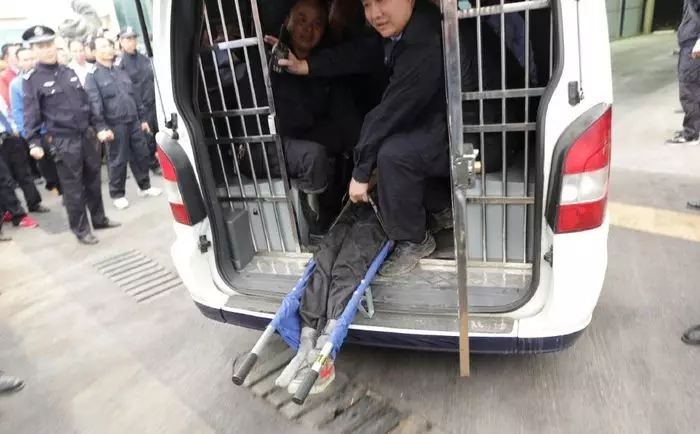 廣東韶關北江監獄越獄的重犯李孟軍,越獄一日後下午在監獄附近落網,之後四肢被綁在擔架,由救護車運返監獄。