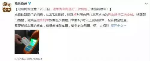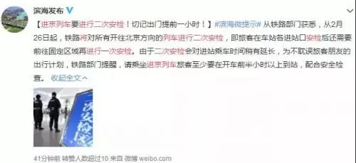 從2月26日起,鐵路將對所有開往北京方向的列車進行二次安檢,即旅客在車站各進站口安檢後還需要前往固定區域再進行一次安檢。