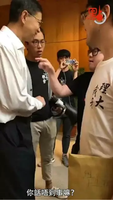 當日態度最激的何俊謙(右2)指罵理大副校長沈岐平(左1)。