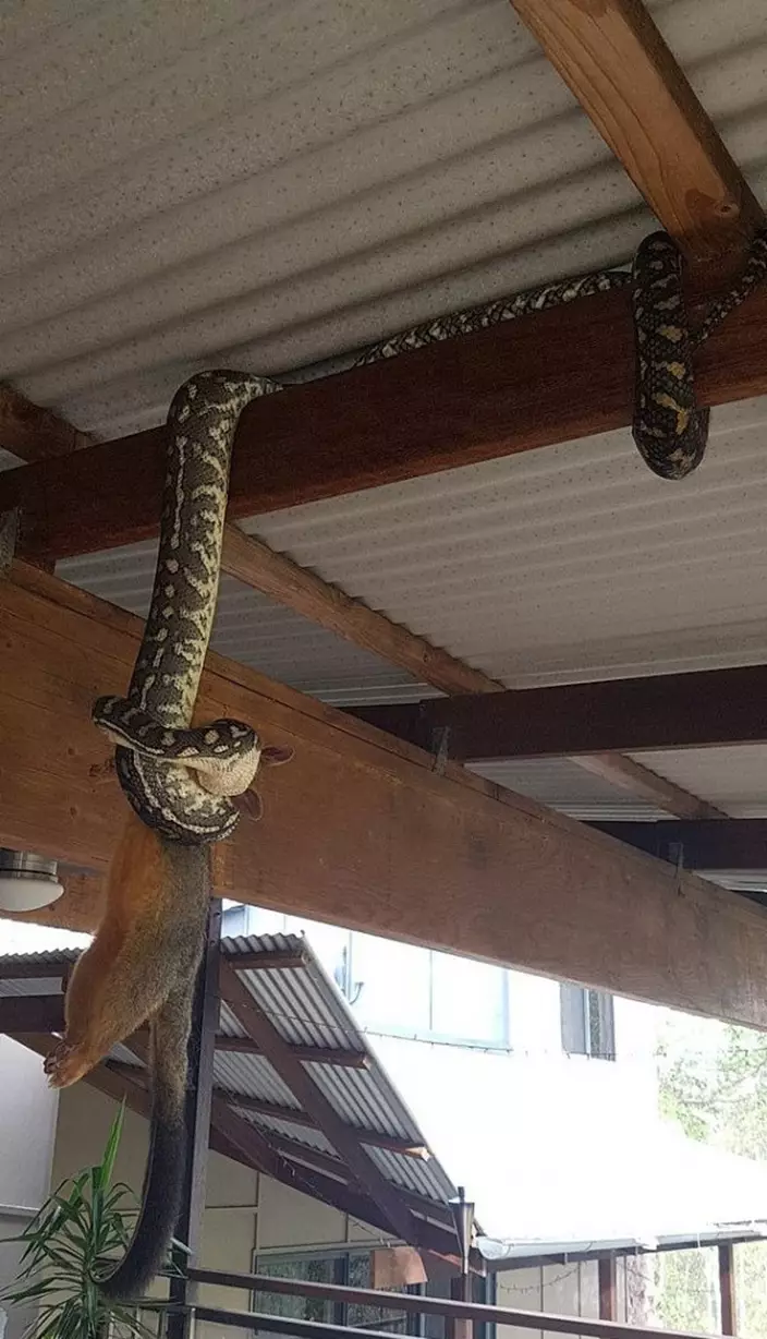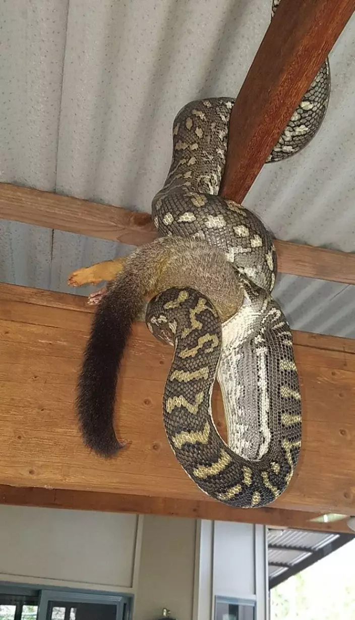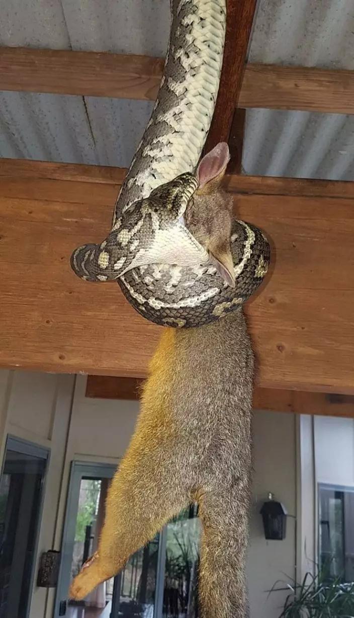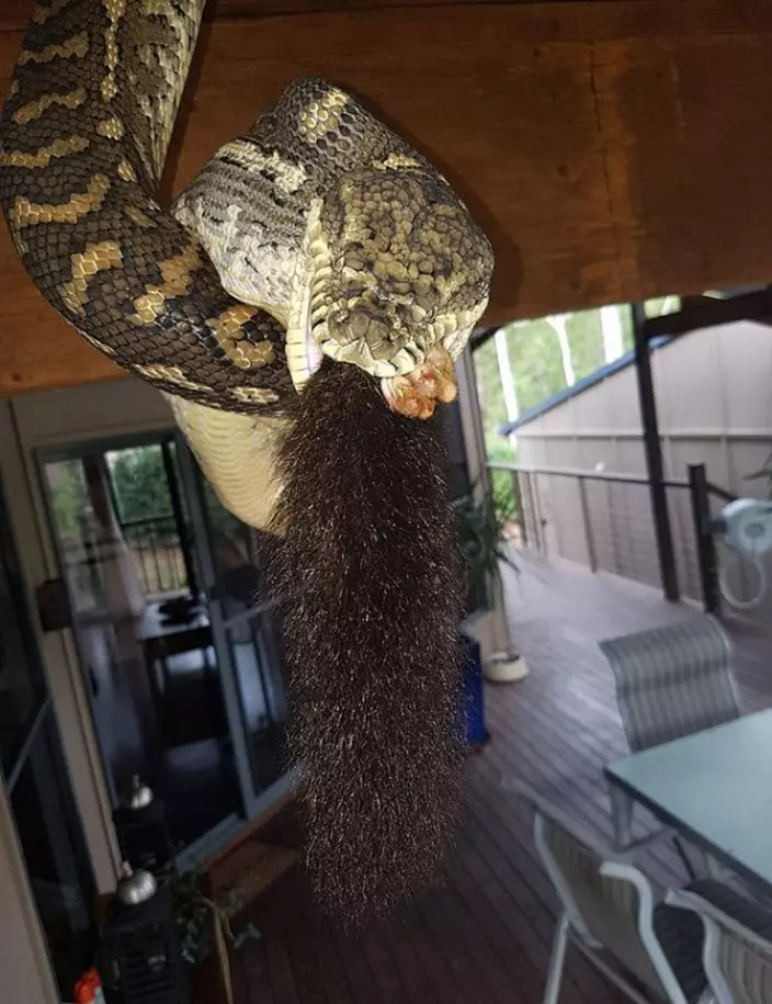 一條巨大的蟒蛇纏在涼棚上,正試圖吞下一隻負鼠,Smedle透露,這條蛇花了大概25分鐘來享受美味。他還拍下整個過程,並上傳到社交網站。