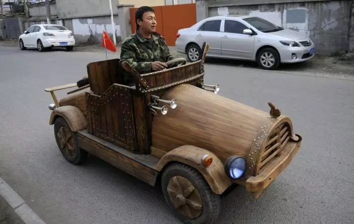 瀋陽經驗豐富的木匠劉福龍自製出一輛長16米、寬12米、重達200多公斤的「木質電動轎車」,時速最高30公里。