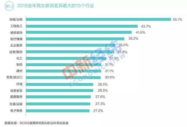 從行業上看,男女薪酬差距較大的領域主要集中在採掘冶煉、化學等工程製造類行業。這些領域中,男性因擁有生理優勢,在勞動參與率和職級晉陞方面均顯著佔優。2018年,工程製造領域的高級管理職位中男性平均佔比超過95%,高層職位男女比例嚴重不均導致雙方薪酬差異處於高位。