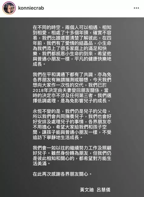 呂慧儀發放一份與黃文迪的共同聲明,稱已去年離婚,變回朋友關係。