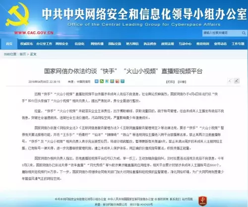 去年4月,國家網信辦官方網站發佈消息:針對「快手」“火山小視頻”平台上傳播涉未成年人的低俗不良信息,國家網信辦對這兩個平台進行了約談,並要求其進行整改。