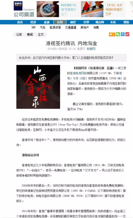 話說內地財新網今日下午發出一段關於港視簽約騰訊的報道,傍晚在首頁抽起,在文章所屬的公司分類頁面亦都找不到文章的連結,若然你已知文章標題去搜尋,就仍然有連結直接去文章。簡單點說,文章從主要頁面隱沒。