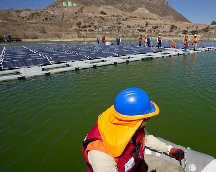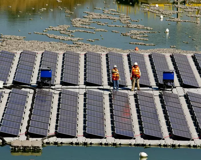 這座太陽能電池板島由256塊太陽能電池板組成,漂浮在水面,發電能力為86千瓦,被拴在人工潟湖的底部,以確保即使在強風和水位不斷變化的情況下,也能保持正確的方向。除了發電,太陽能電池板還有助於減少水的蒸發,提高效率。