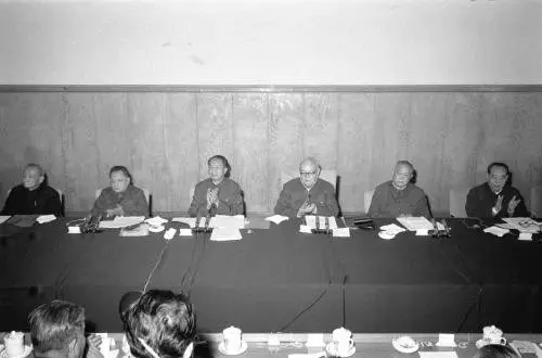 (從左至右)陳雲、鄧小平、華國鋒、葉劍英、李先念、汪東興在十一屆三中全會上(資料圖)