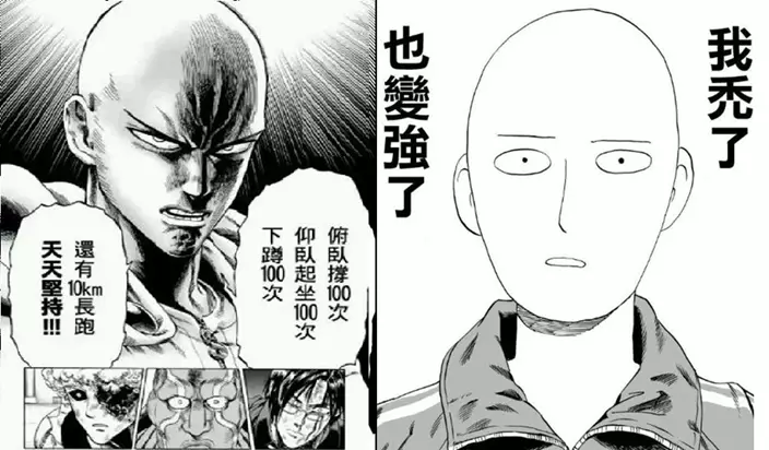 漫畫《一拳超人》中,琦玉老師憑著意志力,每天進行「掌上壓、仰臥起坐、深蹲」各100次,以及10公里長跑,堅持3 年後獲得「一擊必殺」的能力,但其代價是變成禿頭,近日就有網民實測一拳超人琦玉老師的訓練內容有沒有用。