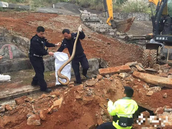 據內地媒體報導,楊先生一家由於臨近清明,準備重修錦坑山上的祖墓,沒想到挖土挖到一半時,突然從旁邊竄出一條如手臂粗的2米長大蛇,由於蛇的身型巨大,他連忙報警求助。