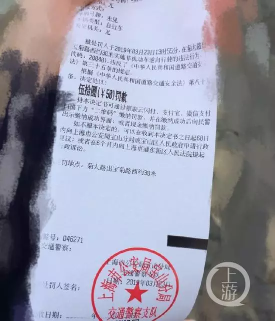 上游新聞記者在網友@熠熠提供的罰單中看到,上海市公安局寶山分局交通警察支隊給出的理由是:「被處罰人實施非機動車逆向行駛的違法行為,違反了《中華人民共和國道路交通安全法》第三十五條規定,根據《中華人民共和國道路交通安全法》第八十九條,決定處以五十元罰款。」