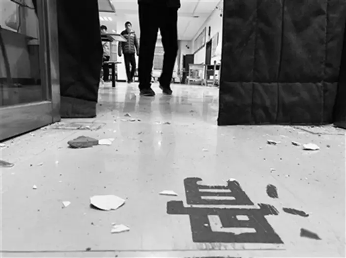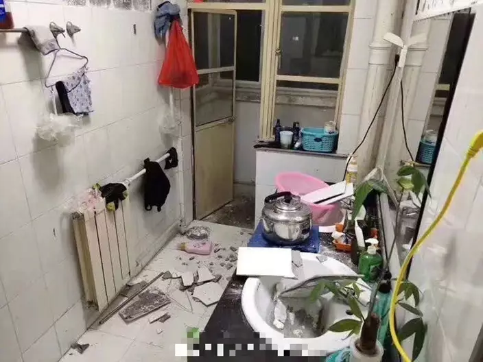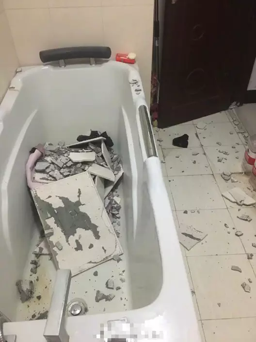 有居民家中牆體、浴室瓷磚大量脫落,碎片掉落一地。微博圖片