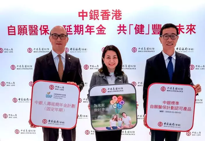 中銀香港、中銀人壽及中銀集團保險携手合作,將於4月1日推出「延期年金計劃」及「自願醫保計劃」,為客戶提供「全方位」的健康及退休保障方案,共「健」豐盛未來。圖為中銀香港個人金融產品部總經理盧慧敏(中)、中銀人壽執行總裁老建榮(左)及中銀集團保險有限公司副執行總裁杜強(右)。