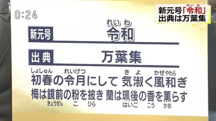 日本於四月一日公佈新年號為「令和」,為即將繼位為天皇的皇太子德仁親王所用,「令和」兩自,選自於和歌歌集《萬葉集·梅花歌卅二首》中,〈宇梅乃波奈〉的梅花之詩,翻譯至中文後為:「於時初春令月、氣淑風和、梅披鏡前之粉、蘭熏珮後之香」。