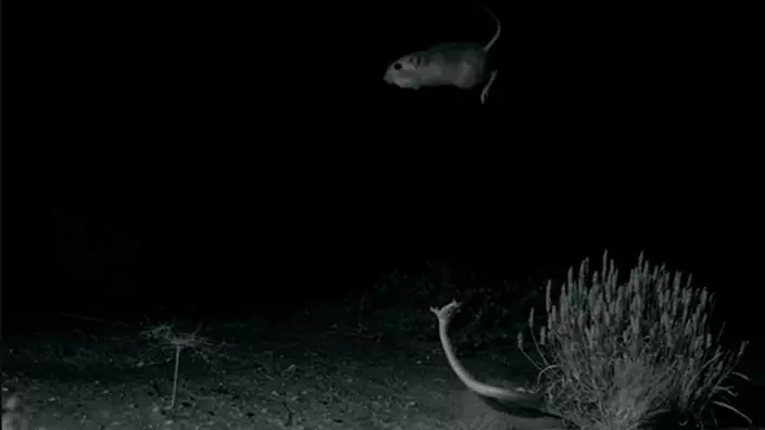 據外媒Science Alert報道,美國加州聖地亞哥州立大學的科學家發現,生活在沙漠地區的跳囊鼠(kangaroo rat)懂得用靈活的跳躍動作,以及凌空踢腿來擊退毒蛇,保護自己。