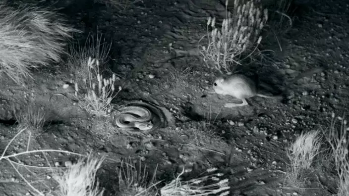 教授克拉克(Rulon Clark)在研究沙漠生態時發現跳囊鼠的逃避方式非常神奇,於是他利用了夜視高速攝影機拍下「跳囊鼠VS毒蛇」的短片。由於跳囊鼠的動作快如閃電,教授要將播放速度調慢30倍,才足以讓人看清楚這場發生在夜間沙漠中的對決。