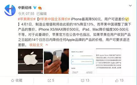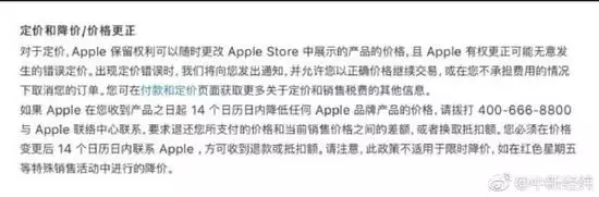 蘋果官方在公告中也指出,如果蘋果在用戶收到產品之日起的14個日曆日內降低任何Apple品牌的產品的價格,用戶可要求退還差額。