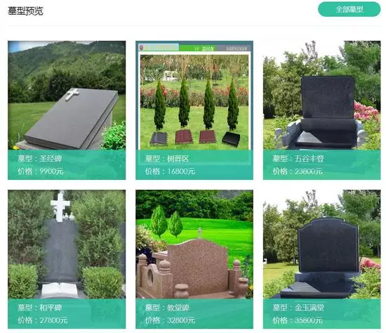 此外,中新經緯客戶端從位於河北省三河市的靈山寶塔陵園官網上看到,墓型被分為了聖經碑、樹葬區、五穀豐登、和平碑等35種類型,價格1萬元-14萬元不等,最便宜的要屬聖經碑,售價9900元,最貴的則是德門吉慶碑,售價達14.6萬元。