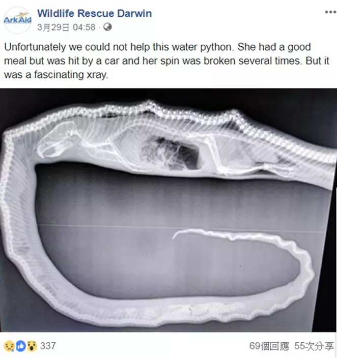 3月29日,達爾文政府野生動物保護人員在路中間發現了一條懷疑被過往車輛撞擊過的水蟒,之後水蟒被送到達爾文Palmertson的Ark Aid野生動物醫院搶救,遺憾的是已無力回天。