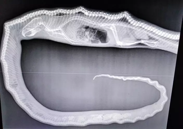獸醫們無法拯救這條脊椎受傷的水蟒,但他們展示了牠的X光照片。從中可以看到,這條蛇的「最後晚餐」正在牠的胃裡「長眠」。