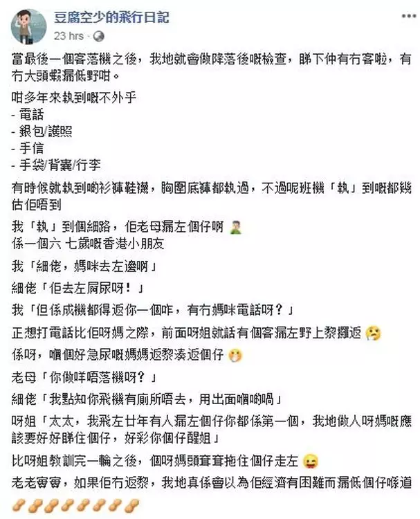facebook專頁「豆腐空少的飛行日記」版主發帖分享,空中服務員每當機上所有乘客落機後,就會檢查機艙,多年來不外乎發現手提電話、銀包、護照、手信,甚至有時會發現內衣、衣物等,但「呢班機『執』到嘅都幾估佢唔到,我『執』到個細路,佢老母漏左個仔啊!係一個6、7歲嘅香港小朋友」。