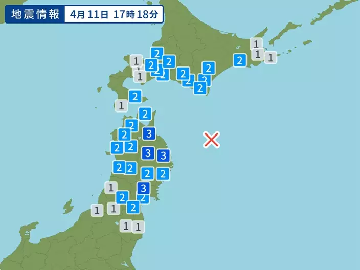 日本氣象廳的地震強度為6級,震源深度10公里,青森縣、岩手縣、宮城縣的地震震度達到3級。