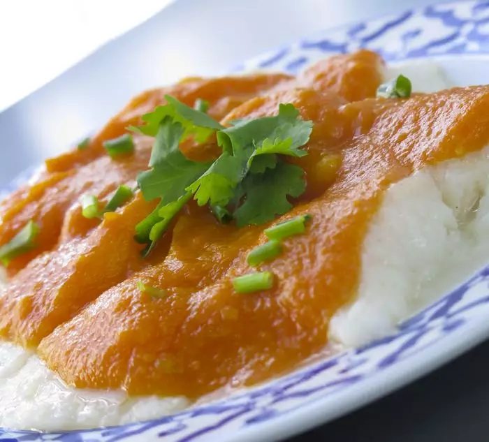 3. 將蕃茄南瓜蓉的放於龍脷柳上,蒸6-8分鐘即成。