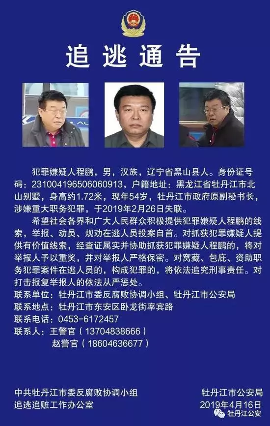 犯罪嫌疑人程鵬,男,漢族,遼寧省黑山縣人,身份證號碼:231004196506060913,戶籍地址:黑龍江省牡丹江市北山別墅,身高約1.72米,現年54歲,牡丹江市政府原副秘書長,涉嫌重大職務犯罪,於2019年2月26日失聯。
