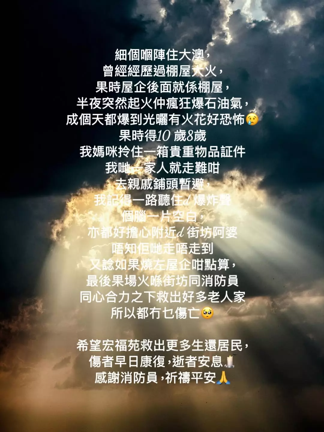 大埔五級火至今釀成55人遇難,嚴重傷亡數字令人痛心。前TVB小花樂瞳(Cilla)亦透過社交平台回應大埔宏福苑五級大火事件,並分享自己童年時在大澳經歷棚屋大火的恐怖回憶。她透露當時年僅約10歲,半夜因棚屋起火引發石油氣爆炸,場面令人震驚。