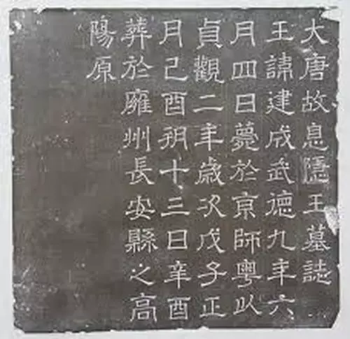 唐高祖李淵嫡長子李建成墓誌銘被盜多時,最終於2013年一宗公安機關破獲的盜墓案件中浮出水面。墓誌銘目前收藏在西安博物院,正面來看墓誌非常寒酸,銘文非常簡單:「大唐故息隱王墓誌,王諱建成,武德九年六月四日薨於京師,粵以貞觀二年歲次戊子正月己酉朔十三日辛酉葬於雍州長安縣之高陽原。」