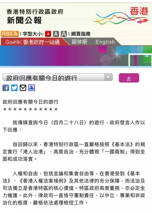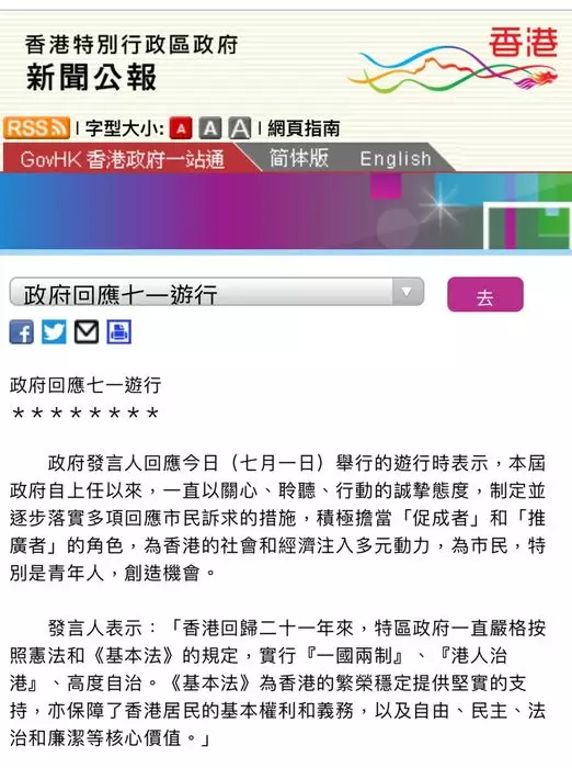 政府在今年1月1日回應元旦遊行的第一段是這樣:「政府發言人回應今日(一月一日)舉行的遊行及公眾集會時表示,政府十分尊重市民參與遊行和集會的權利及發表意見的自由。本屆政府自上任以來,履行「關心」、「聆聽」、「行動」的管治新風格,並努力做好「促成者」和「推廣者」的角色,積極落實一系列政策措施,為香港經濟注入新動力,為市民帶來更美好的生活。」