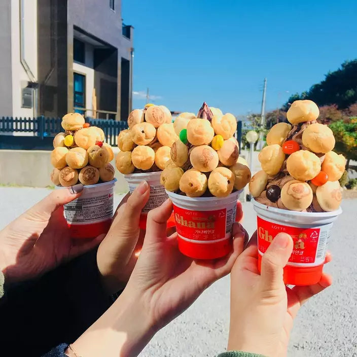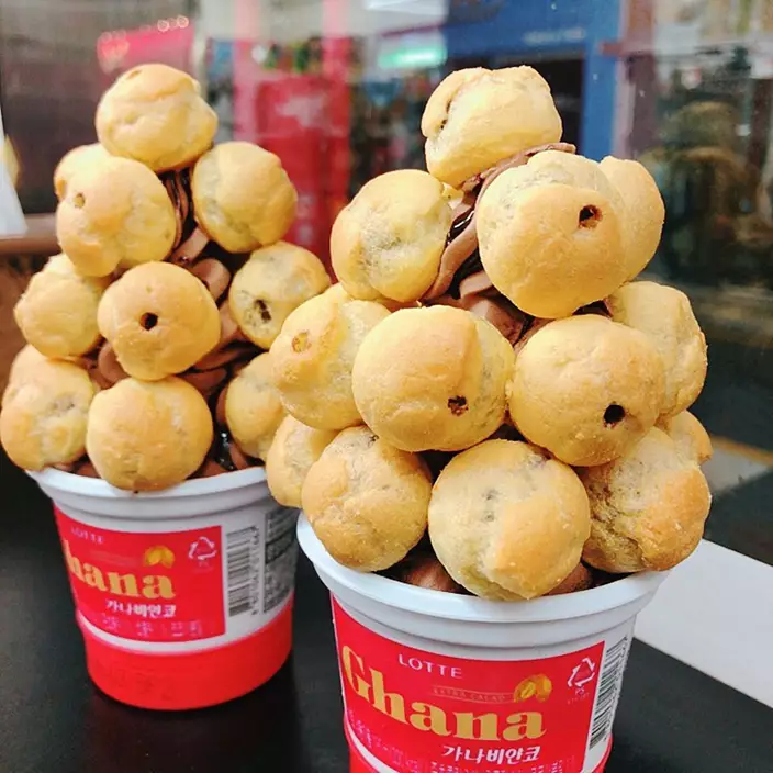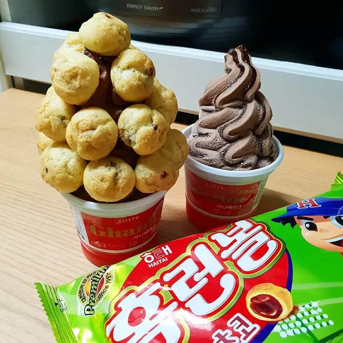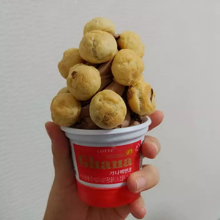 那就是將另一款人氣零食Homerun Ball(홈런볼)朱古力夾心泡芙放上雪糕,然後一起吃!這個泡芙無論是大人還是小朋友都超級喜歡,一盒已經有很多粒,外面的鬆脆的泡芙皮,裏面則是流心的香甜朱古力醬。將它配合朱古力雪糕一起吃,不僅朱古力味Double!連口感也Double!香港雖然沒有這兩款零食,但有類似的產品,所以不妨自己動手試試這個新食法!
