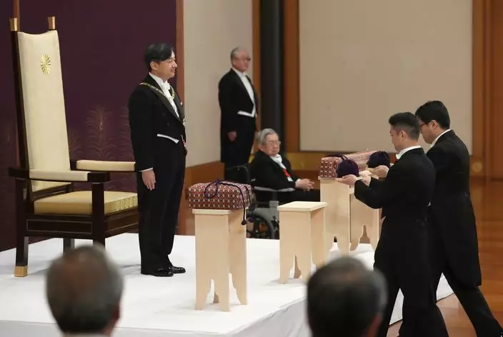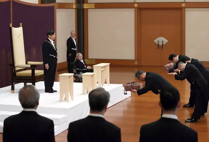 德仁繼承神器八尺瓊勾玉和天叢雲劍。(AP圖片)