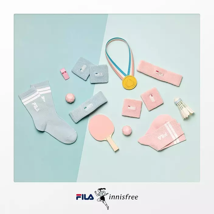 新聯乘系列已經在5月1日,今次更幾乎是專為女士而設,就算是不喜歡做運動的女生也可以輕鬆駕馭的街頭風格。顔色採取了十分青春的淺粉紅和淺藍綠色,讓人聯想到馬卡龍的夢幻色彩。除了T-Shirt外,還有拖鞋、平底鞋、襪子、腕帶和頭帶。就如Fila和Innisfree本身的風格一樣,系列沒有太花巧的設計,主要走簡約少女風,所以不一定是運動才可以穿!