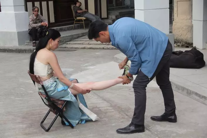 着住高踭鞋係咁踢,難怪子羚踢到抽筋,展鵬即幫手鬆筋。