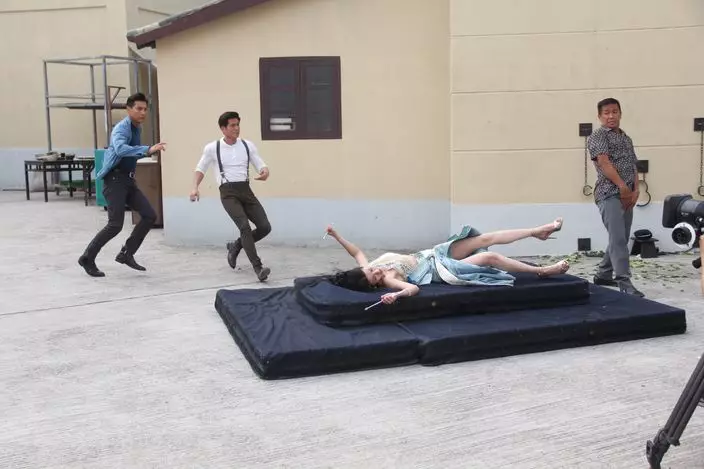 休息了一會兒,子羚又要被兩個武師凌空拋高,撻生魚咁撻落「塌塌米」來配合動作畫面,子羚坦言拍得幾辛苦:「打到滿身傷痕,用遮瘕膏局部遮都搞唔掂,最誇張要用噴槍將遮瘕膏噴晒成隻手。」