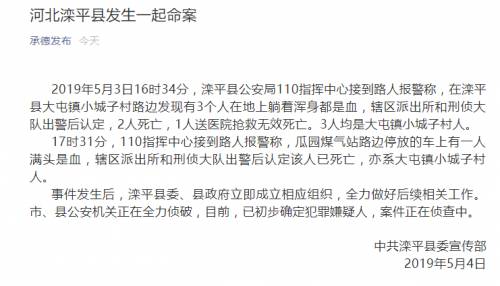 2019年5月3日16時34分,灤平縣公安局110指揮中心接到路人報警稱,在灤平縣大屯鎮小城子村路邊發現有3個人在地上躺著渾身都是血,轄區派出所和刑偵大隊出警後認定,2人死亡,1人送醫院搶救無效死亡。3人均是大屯鎮小城子村人。