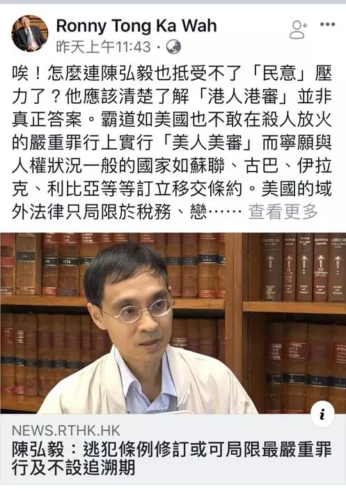 逃犯條例修訂大起爭拗,外界正觀望港府會否再讓步之時,基本法委員會委員、港大法律學院教授陳弘毅出2萬8000字長文,對條例提出質疑,指出巿民擔心行政長官難以拒絕由中央政府提出的移交逃犯要求,令有關安排變成中港兩地移交逃犯的常規做法;他認為政府若堅持繼續修例,亦要加入3項保障,包括只涵蓋最嚴重的罪行(most heinous crimes)、不設追溯期、實行「港人港審」,即不移交港人到內地,改為在香港受審。