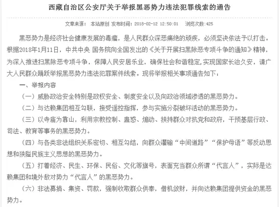 其實早在去年2月,西藏自治區公安廳就發佈了關於舉報黑惡勢力違法犯罪線索的通告,發動群眾舉報「與達賴集團相互勾聯,接受遙控指揮」等黑惡勢力。