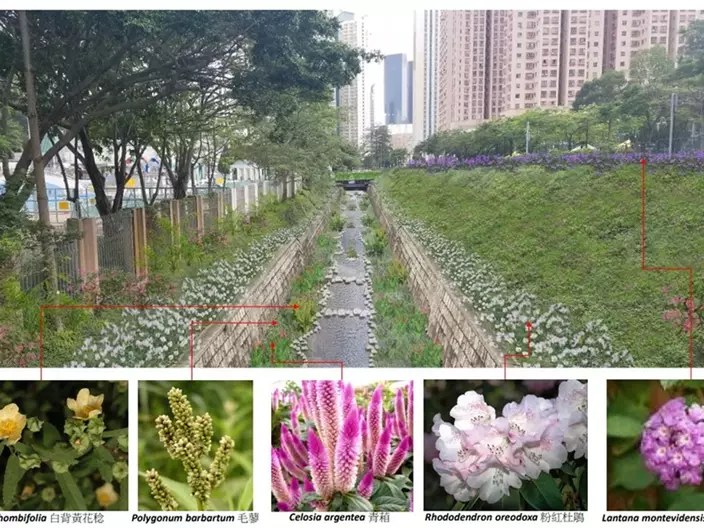 本港早年興建排水明渠主要以石屎建造,在外觀和生態環境方面並不理想。渠務署最新建議,將佐敦谷明渠上游位置,因應較幽閉環境進行生態改善工程,例如加強綠化,種植粉紅杜鵑、青葙等具有觀賞性的植物,並會加設水池和魚梯。而下游較近淘大花園的位置,署方就建議除了園境美化,如廣種小葉馬纓丹,亦會於明渠上建造觀景平台,為居民提供休憩空間。署方指如項目獲支持,可於今年內動工,並於二二年完成。