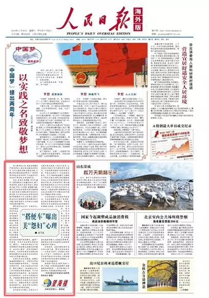 由上周二起,人民日報海外版的頭版,連續五日在「望海樓」的專欄發表五篇有關美國的評論文章,睇睇五篇文章的題:《美方攪局南海小心引火焚身》、《美國式國際治理模式當反思》、《新型大國關係讓美國吃虧了?》、《國際秩序嬗變炙烤美國偏執心態》、《“搭便車”曝出美“怨婦”心理》,都應該估到,文章對美國的外交政策好有意見,有警告美國唔好在南海問題上玩火,亦有質疑美國不少人,仍將霸權作為衡量得利與否的標準,搵機會干涉中國內政等等。